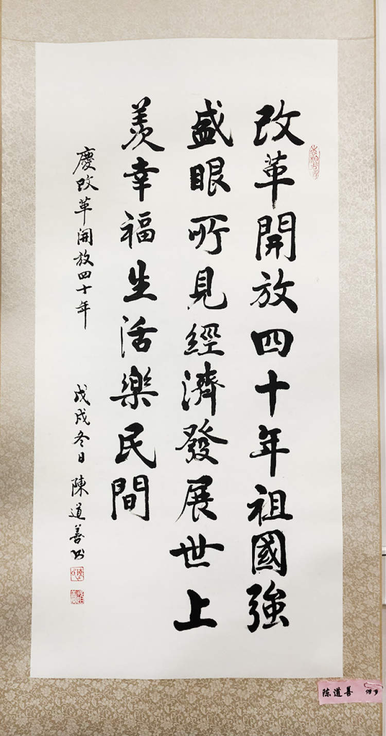 在泰尔乐书画社,有一位名叫陈道善的老人,马上就要99岁高龄了。他不仅年龄最长,每天还坚持提笔练书法,“活到老学到老”用在陈老身上就再合适不过了。每年书画展,陈老总是会给大家带来惊喜,今年也不例外。一副《庆改革开放四十年》与时俱进,内容原创,朗朗上口,让观者在欣赏精湛笔墨的同时,更能体会到时代的沧海巨变。