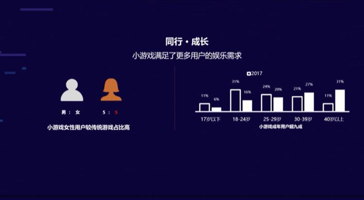 据今天微信公开课提供的数据统计,相较于传统游戏,小游戏的女性用户占比极高,男女比例达到了5:5。