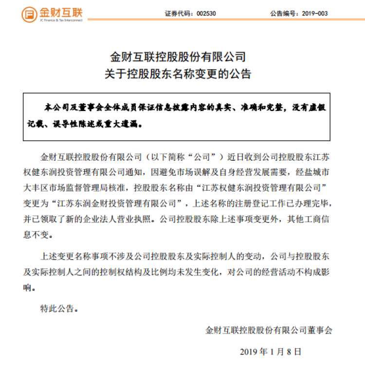 根据金财互联公告,近日收到公司控股股东通知,因避免市场误解及自身经营发展需要,经盐城市大丰区市场监管局核准,控股股东名称由“江苏权健东润投资管理有限公司”变更为“江苏东润金财投资管理有限公司”,上述名称的注册登记工作已办理完毕,并已领取了新的企业法人营业执照。