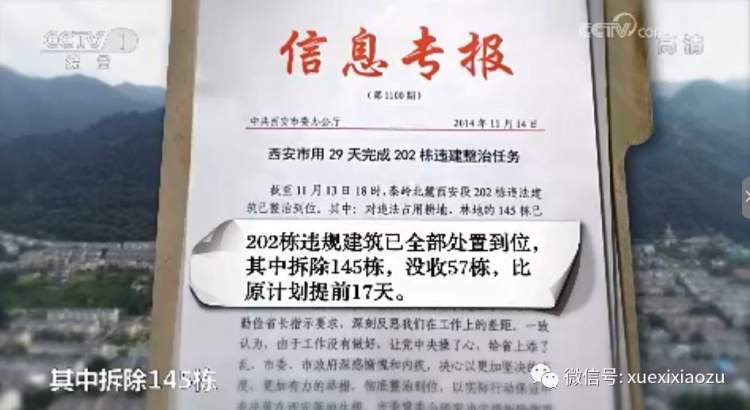 在习近平第二次批示之后的一个月,西安市委向陕西省委报告整改情况:202栋违建已全部处置到位,其中拆除145栋,没收57栋,比原计划提前17天。