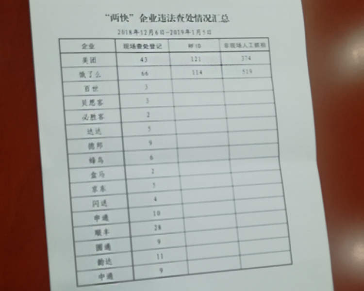 仅从2018年12月6日-1月5日,一月之间,通过现场查处登记,电子拍照、以及现场人工抓拍三种方式就抓拍了大量“两快企业”骑手违法行为。其中饿了么骑手交通违法行为最多,高达699起,美团次之,共538起,顺丰28起,申通10起 ,中通9起。