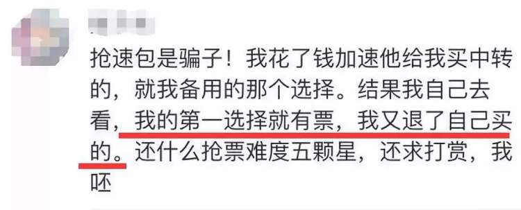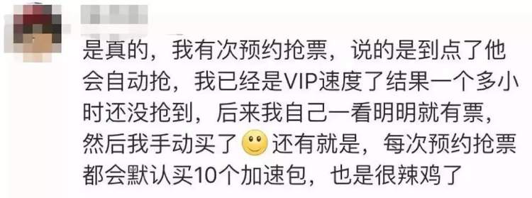 最让人气愤的套路可能是接下来要说的这一个:有些用户发现,自己抢票抢了好几次,都是用了加速包抢不到,不用加速包反而能抢到。更令人哭笑不得的是,有人买了抢票软件的VIP开始刷票,却突然发现12306上明明可以直接买!