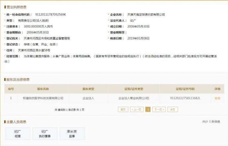 从国家企业信用信息公示系统的显示,天津权健足球俱乐部已经完成了工商更名的程序,正式将俱乐部的名称更改为“天津天海足球俱乐部”。