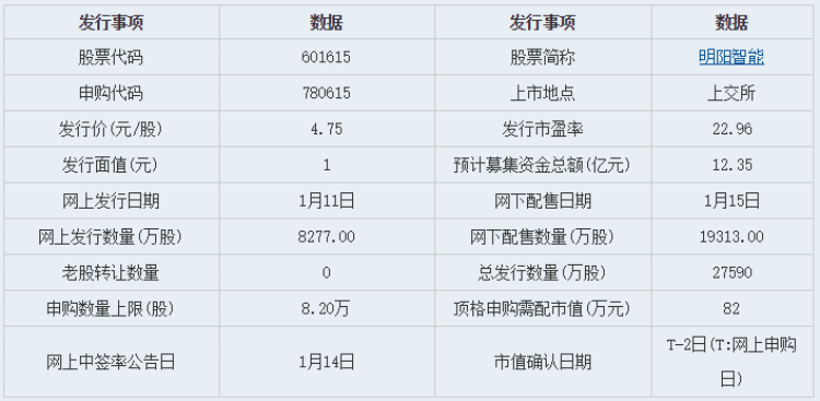 明阳智能明日申购!如果中签,每签红包预期8500元左右 刘奇涛 2019-1-10 来源:周到上海 本周最后一个新股申购来了! 明阳智能1月11日申购,按1年以来新股上市平均涨停板计算,该股每签红包预期约8500元。 ●股票代码:601615 ●申购代码:780615 ●申购价格:4.75元 ●网上发行:8277万股 ●发行市盈率:22.96倍 单一帐户申购上限82000股,申购数量为1000股整数倍,顶格申购需配上交所市值82万元。申购具体事项和公司财务概况见下表。 据介绍,明阳智能主营业务为新能源高端装备制造,新能源电站投资运营及智能管理业务。 来源:周到上海 作者:刘奇涛 赞一个 (0)