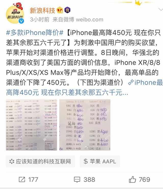 微博号@新浪科技援引《每日经济新闻》的消息称,1月8日晚,华强北渠道商收到了美国方面的调价信息,多款iPhone均开始降价。其中,去年苹果发布的新机iPhone XR降价幅度最大,仅渠道价便下降450元,目前售价为5250元。
