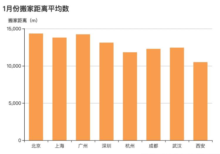 搬家距离方面,八城的平均搬家距离在10km至15km之间,北、上、广、深的平均搬家距离超过12km,其中北京是平均搬家距离最远的城市,平均搬家距离达到了14.52km,上海的平均搬家距离则为14.08km,排名第二。