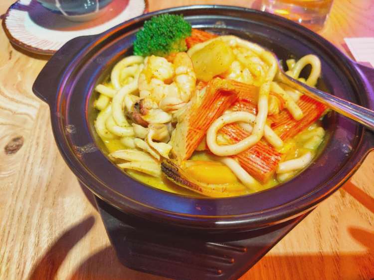 咖喱海鲜煲的咖喱香草味更重,和虾肉、鱿鱼脚等搭配得当,美中不足的是这道菜的贝类肉质偏老。