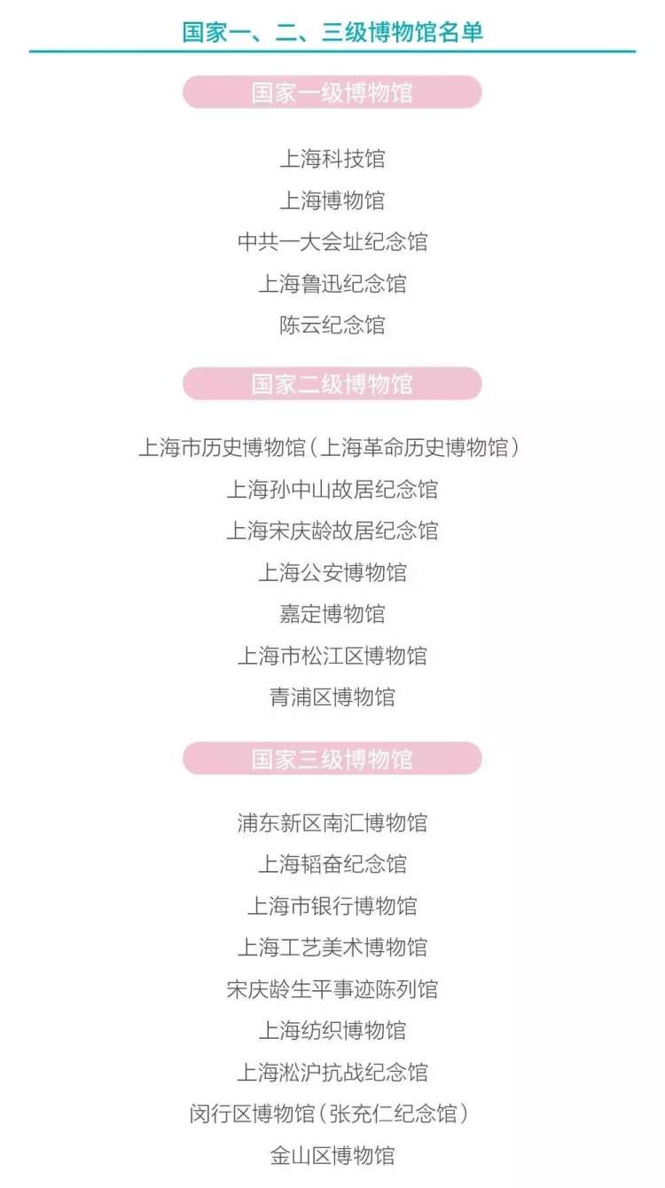 恭喜!国家一、二、三级博物馆,沪21家入围! 上海市文化旅游局 2019-1-24 来源:上海市文化旅游局 你平时最喜欢逛申城哪家博物馆?市文化旅游局说,上海科技馆、上海博物馆、中共一大会址纪念馆等21家入围国家一、二、三级博物馆名单。详见↓ 国家一、二、三级博物馆名单(上海) 来源:上海市文化旅游局 作者:上海市文化旅游局 赞一个 (0)
