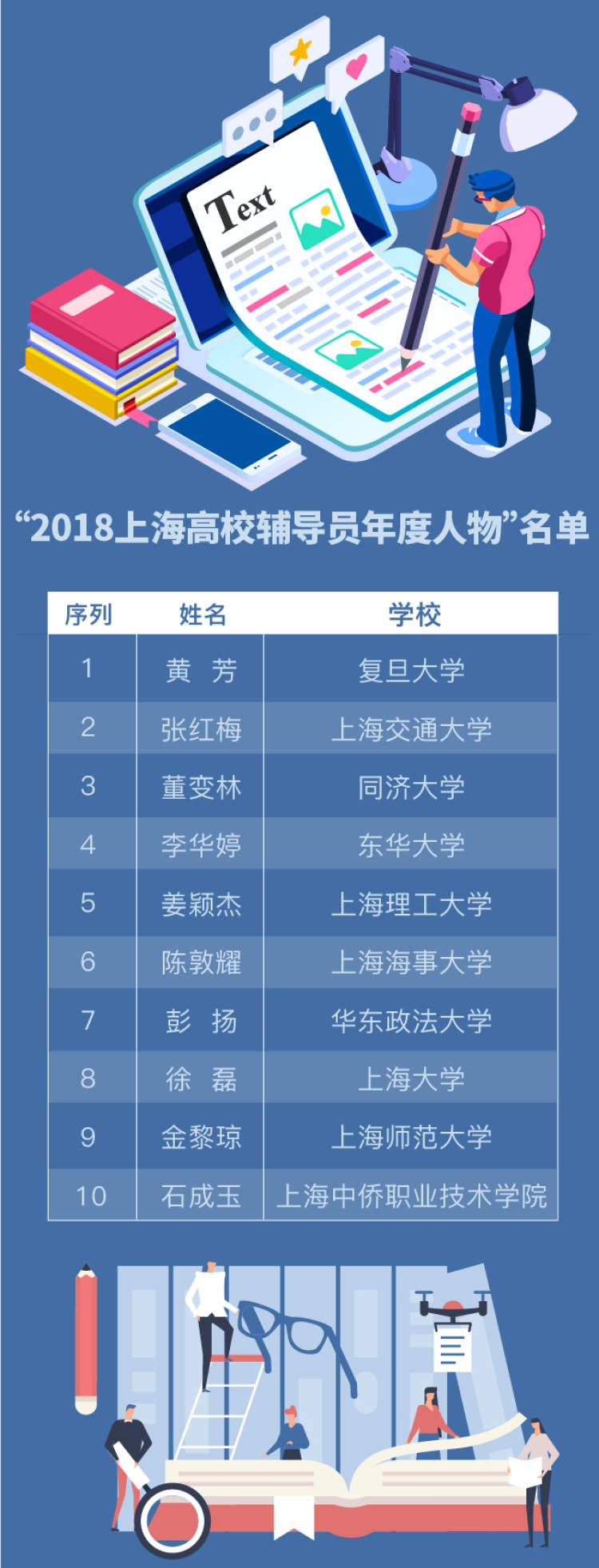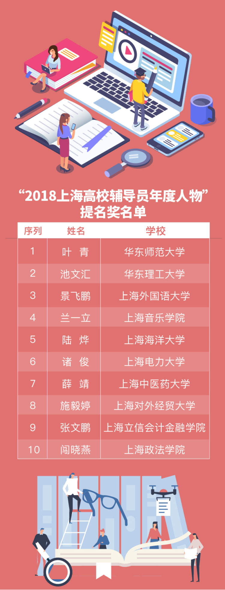 “上海高校辅导员年度人物”名单出炉 有你认识的老师吗 杨青霞 2019-1-24 来源:周到上海 市教委公布,复旦大学黄芳等10人获“2018上海高校辅导员年度人物”,华东师范大学叶青等10人获“2018上海高校辅导员年度人物”提名奖。 这其中有你认识的老师吗? 来源:周到上海 作者:杨青霞 赞一个 (0)