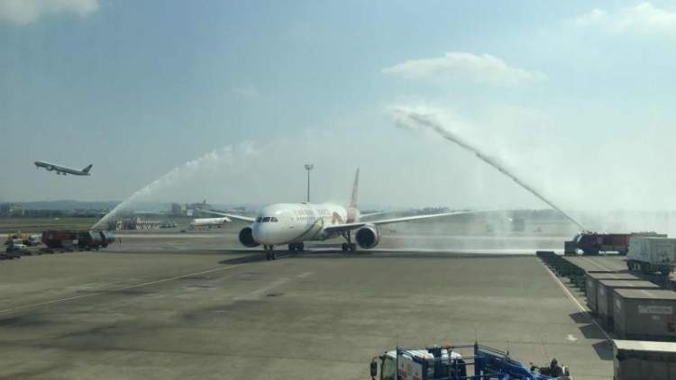 随着飞机的平稳降落,标志着吉祥航空波音787首飞上海-台北航线圆满成功、并正式开始执行地区航线。