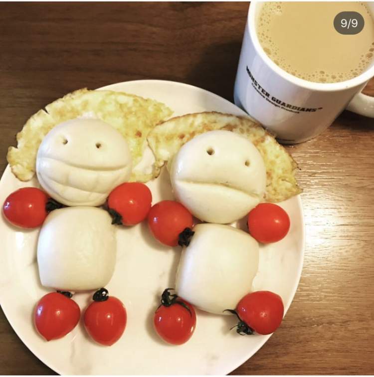 八个番茄和四个小馒头、两个煎蛋做成的爱心小人: