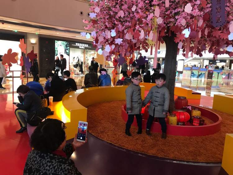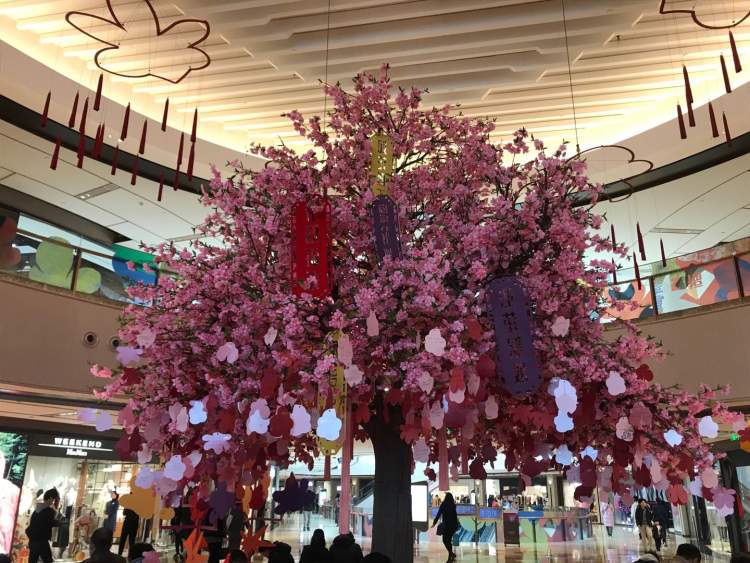 兴业太古汇二楼北厅现在已经“种”上了一棵四周悬挂着祝福丝带的许愿桃树,枝桠间挂满消费者们亲手写下的对自己与亲朋好友的新春祝福卡。许愿树周围漂浮着梦幻的花花“云朵”,树下散落着可以用来休息的柔软“花朵”坐垫,四周的多彩花花装置更是新春最佳合影背景。