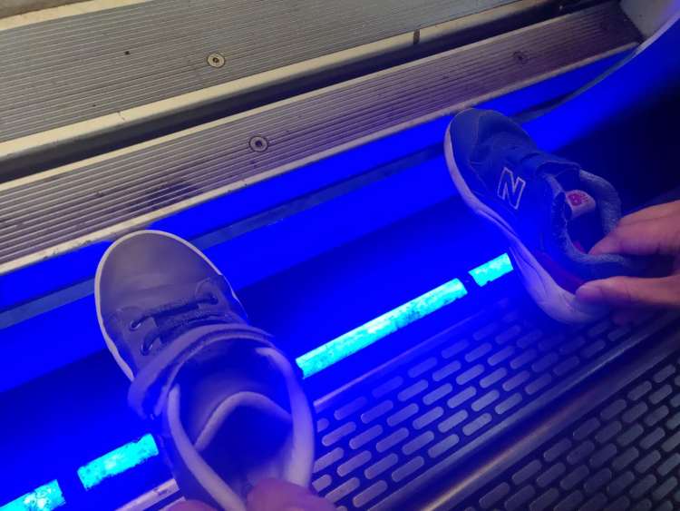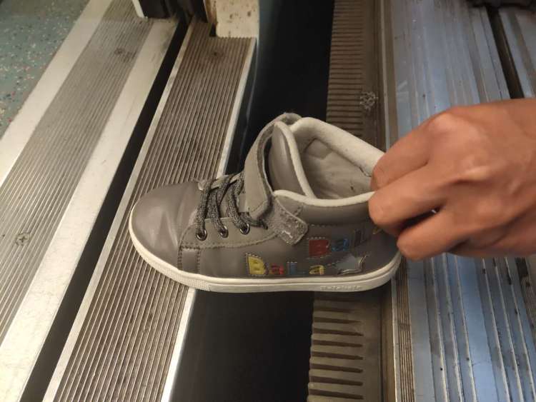 以12号线汉中路站为实测点,该站站台缝隙为15㎝,周到君特意拿了两双29码,内长19cm,大约适合五六岁孩子的球鞋做比对: