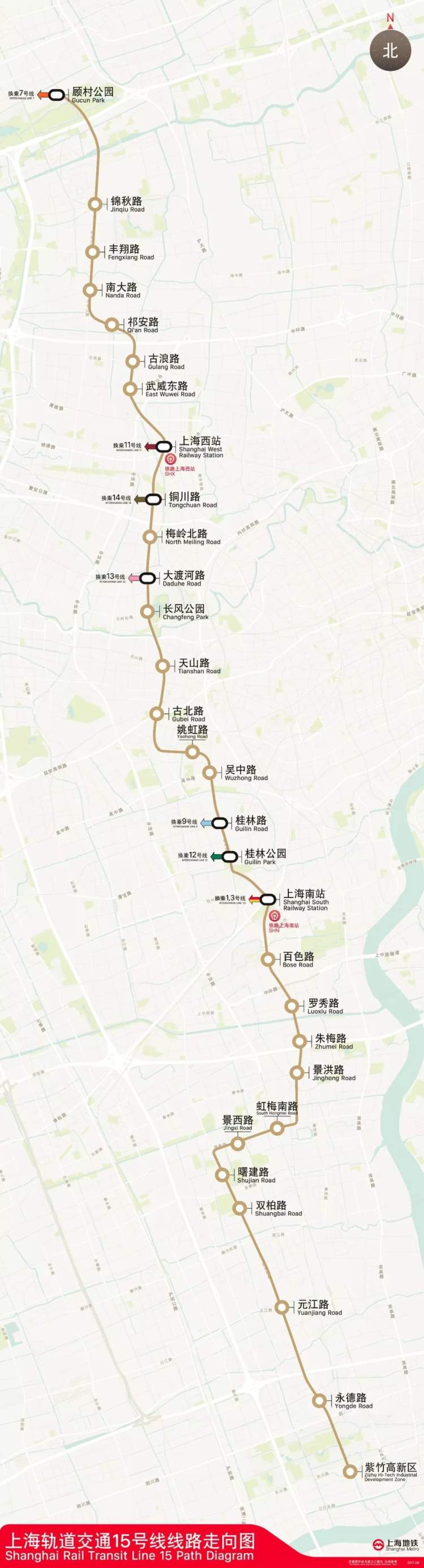 轨道交通15号线途经宝山区、普陀区、长宁区、徐汇区、闵行区5个行政区。起自宝山顾村公园,止于闵行紫竹高新区。全线共设30座车站,全长约42.3公里,均为地下站。