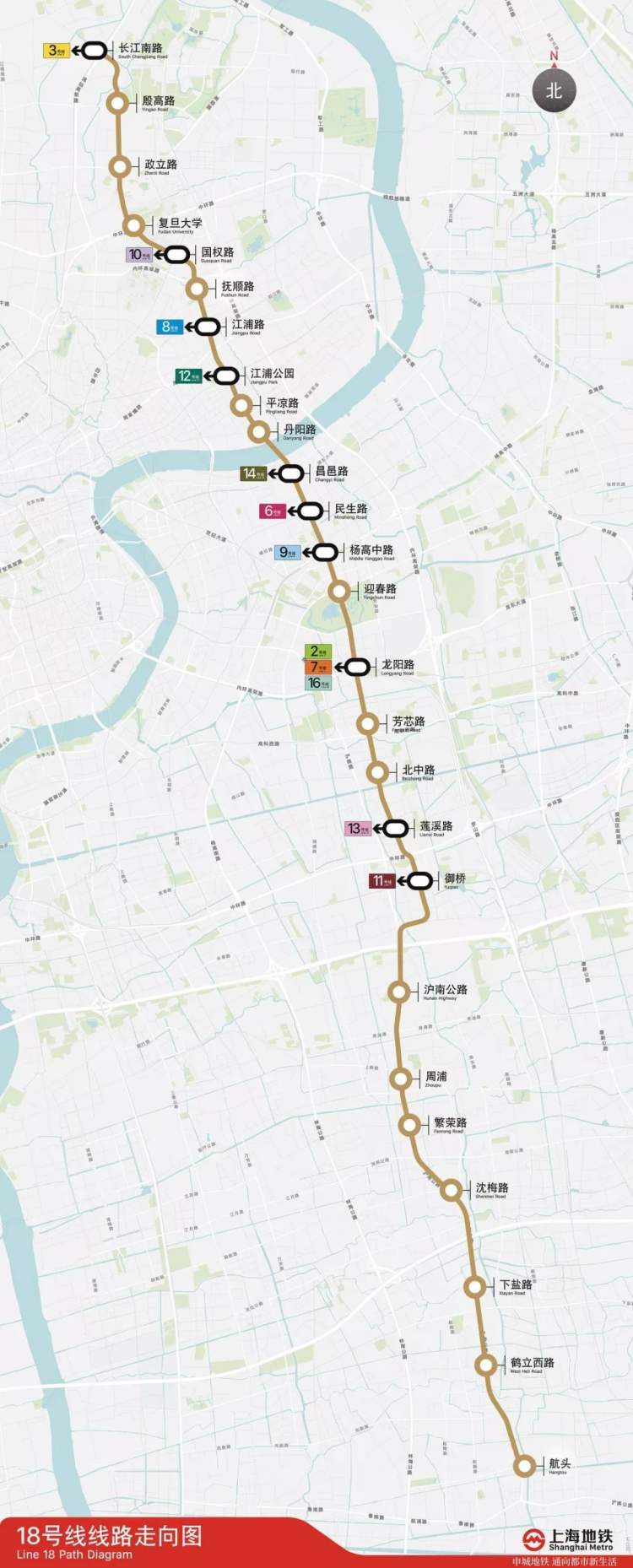 轨道交通18号线工程始于宝山区长江南路站,终于浦东新区的航头镇。线路全长约36.8公里,设车站26座,全部为地下线,沿线经过宝山区、杨浦区、浦东新区等3个区。