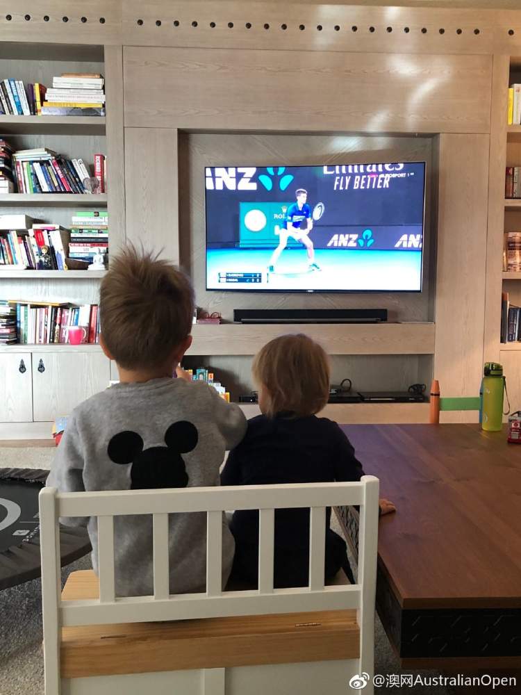 老爸的出色表现,两位小小德在电视机前看得聚精会神。