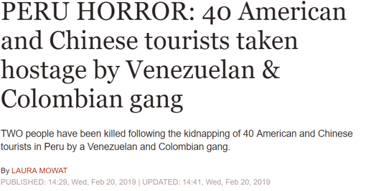 前一天,英国《每日快报》20日报道称,秘鲁东部马德雷德迪奥斯地区一间豪华酒店遭一伙委内瑞拉和哥伦比亚劫匪抢劫,40名来自中国和美国的游客遭绑架,事件中还有2人死亡。