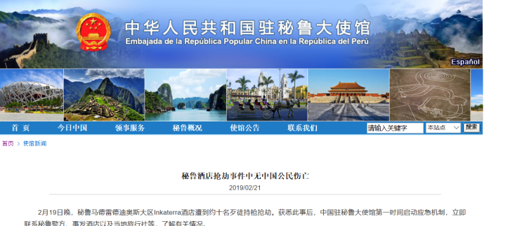 对于广泛关注的“秘鲁酒店抢劫事件”,中国驻秘鲁大使馆21日在其官网发布消息,称无中国公民在此事件中伤亡。
