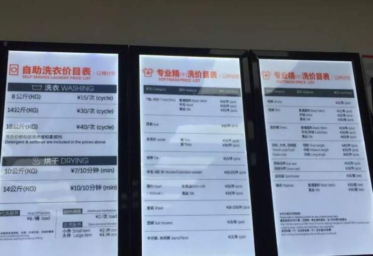 价格表上,小编也看到,根据洗的衣服重量,可以自助的选择大桶和小桶,但是如需烘干,需要再支付费用。