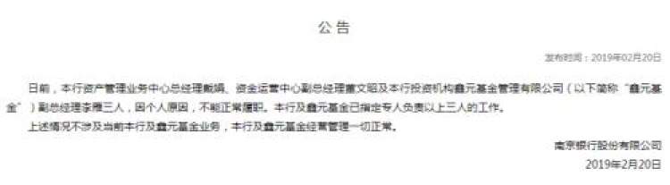 昨日,南京银行发布公告称,“日前,本行资产管理业务中心总经理戴娟、资金运营中心副总经理董文昭及本行投资机构鑫元基金管理有限公司副总经理李雁三人,因个人原因,不能正常履职。本行及鑫元基金已指定专人负责以上三人的工作。上述情况不涉及当前本行及鑫元基金业务,本行及鑫元基金经营管理一切正常。”
