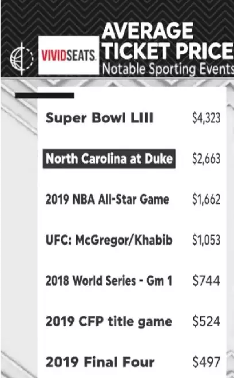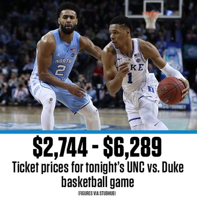 作为NCAA传统劲旅,杜克与北卡的对决本身就吸引了许多球迷的关注。而今年,由于锡安·威廉姆森这位状元大热的存在,赛前这场球赛的票价就已经被炒到天价了。据悉,在票务网站上,这场比赛卖出的最低门票价格为2744美元,最贵门票甚至被炒到了6289美元。