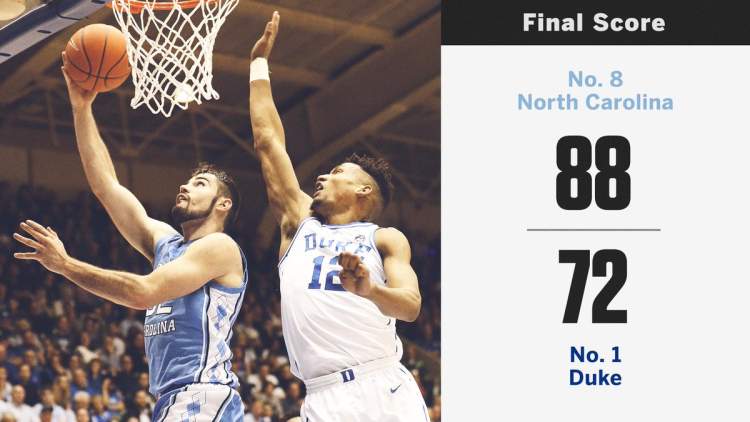 在随后的比赛中,缺少了锡安的杜克大学始终被北卡大学所压制。如同解说员所说,在锡安受伤离场的那一刻,这场比赛就基本盖棺定论了。