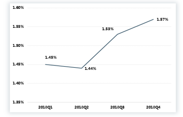 全年租售比上涨显著,主要是房价2018年出现下滑,但是租金上涨明显。其中,第三、四季度全市租售比出现较大幅度增长,到2018年第四季度的租售比达到全年峰值,为1.57%。