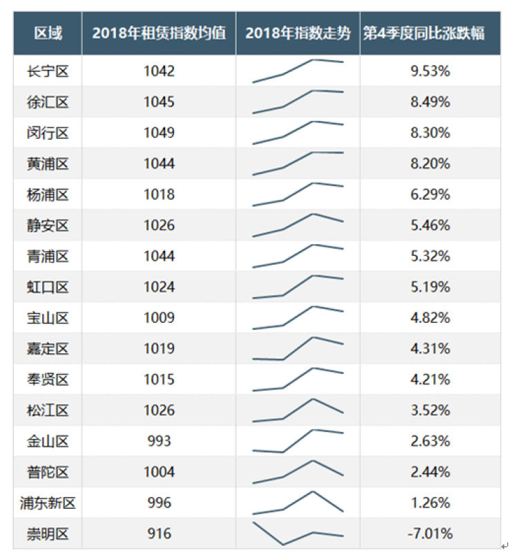 具体到区域市场租赁指数来看,2018年第4季度,所有区域的指数都出现不同程度的下跌。但与去年第四季度比较,同比仍有较明显的上涨。除崇明区下降外,其他区域指数都同比上涨,同比涨幅最高未超10%。