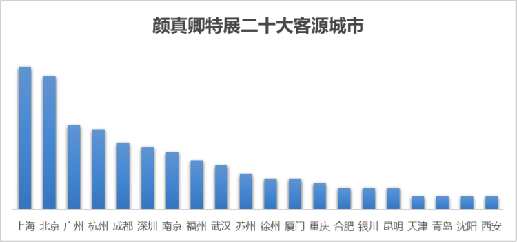 颜真卿特展在网络上引起轰动,又是哪些人最后选择前往观展呢?数据显示,从下单预订展览门票的用户看,颜真卿特展的二十大客源城市分别是上海、北京、广州、杭州、成都、深圳、南京、福州、武汉、苏州、徐州、厦门、重庆、合肥、银川、昆明、天津、青岛、沈阳和西安,这些城市的游客对颜真卿特展的兴趣最高。
