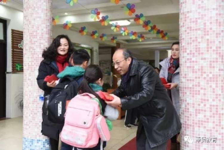 昨天,奉贤区实验小学党支部书记夏军芳和校长金哲民等等候在校门口,亲手为孩子们送上精心准备的开学“五福”红包,红包里装着分别代表“敬业”“智慧”“健康”“圆梦”“如意”五福,代表着新学期师长们对孩子们的期许和要求。