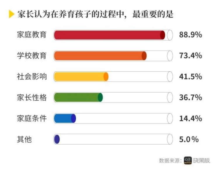 在被问及“您认为在养育孩子的过程中,最重要的是什么”时,有88.9%的家长认为“家庭教育”很重要,还有73.4%的家长认为“学校教育”很重要。