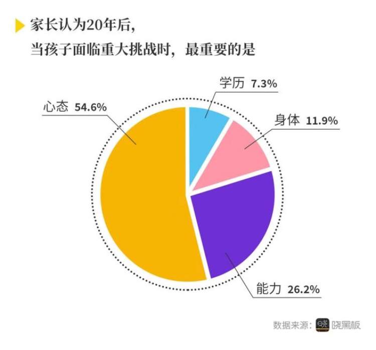 数据显示,家长对孩子的心理健康越来越重视。调查中发现,在被问及“20年后,当孩子面临重大挑战时,最重要的是什么”时,能力、学历、心态、身体这四项因素中,54.6%家长认为最重要的是孩子的心态,认为学历最重要的家长仅7.3%。