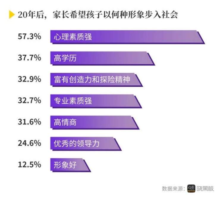 通过对12000多份有效问卷的数据分析,“晓黑板”发现,家长希望孩子能以一个“心理素质强”、“高学历”、“富有创造力和探险精神”、“专业素质强”的形象步入社会,其中“心理素质强”得分最高,得到57.3%家长的重视。