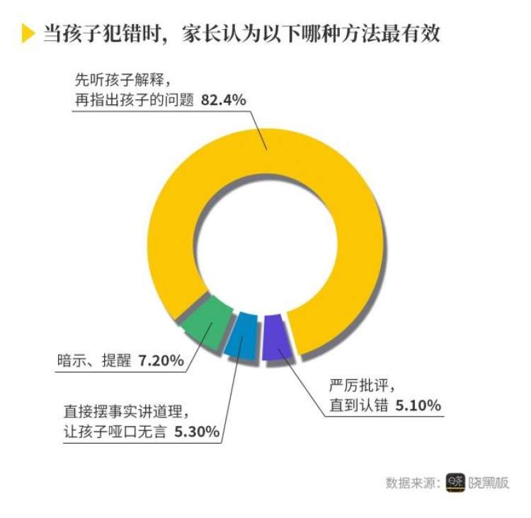 而被问及“当孩子犯错时,您认为哪种方法最有效”时,82.4%的家长选择“先听孩子解释,再指出孩子的问题”。