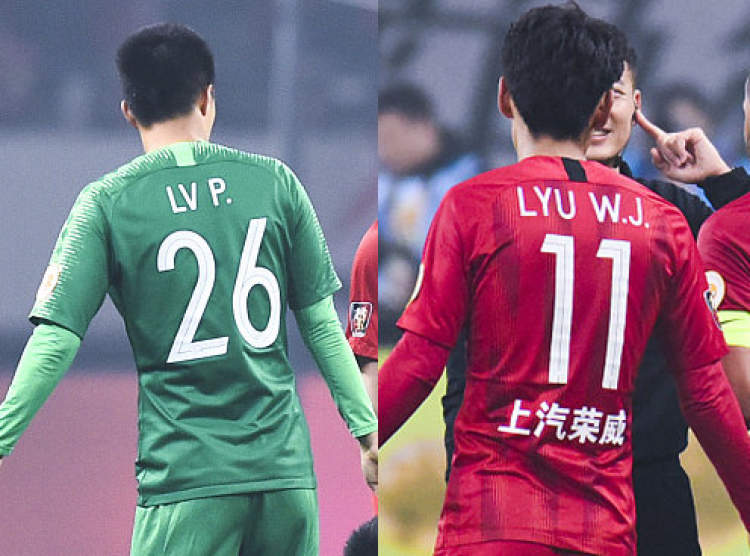 但是美中不足的是,我们发现两队的拼音使用和缩写并不统一。国安的吕鹏和上港的吕文君,两人都姓吕,但是吕鹏球衣上印的是“LV P.”,吕文君球衣上印的是“LYU W.J.”,吕的拼写不同。