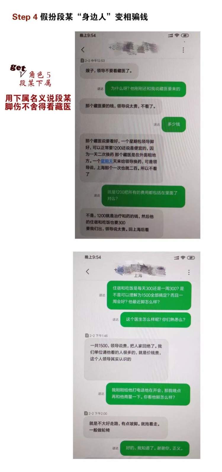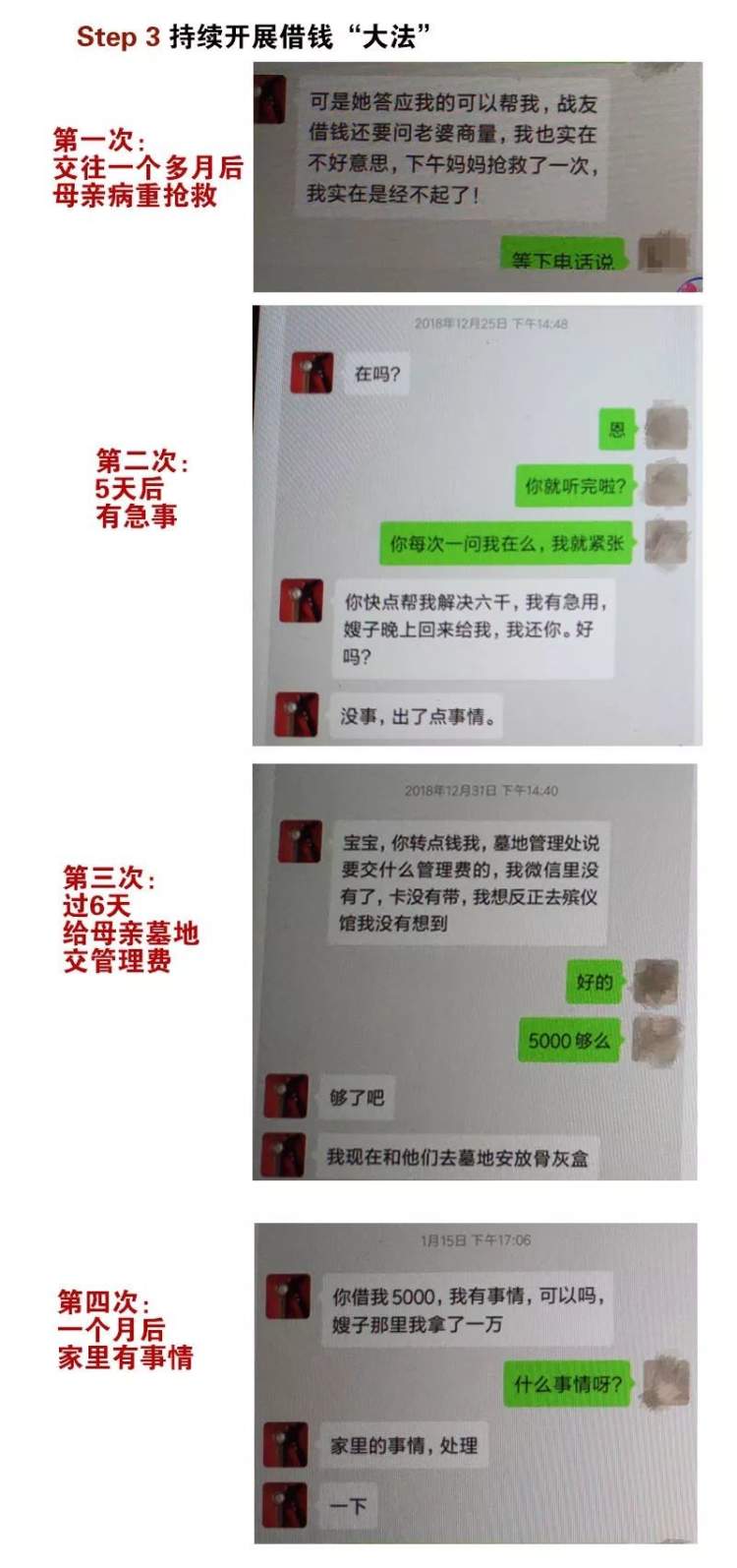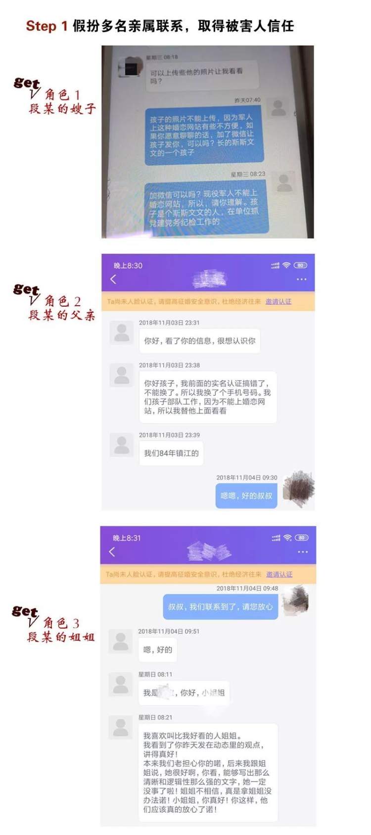 黄某通过微信聊天、手机短信、变声电话通话等方式,一人分饰段某的父亲、姐姐、朋友、下属、领导妻子等7重身份,同时利用发红包、邮寄礼品等维持与被骗女性的关系。随后,她针对不同女性的情况,编造各种理由借钱,随后玩消失。