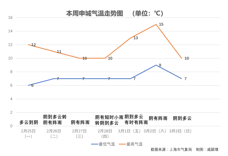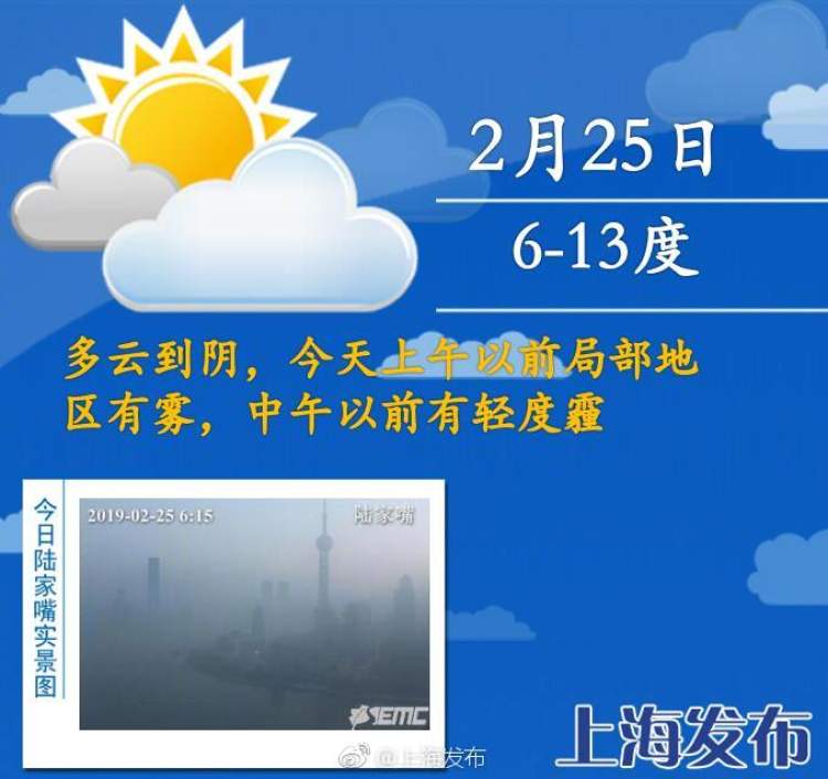 难得“阳光周一” 太阳连上三天班 明天雨水又重来 周到君 2019-2-25 来源:周到上海 本周,上海难得以晴朗开局。今天,是上海2月中旬以来首个“阳光周一”。 今天虽然有机会见到阳光,但云系较昨日增多。今天本市多云到阴,气温6-13℃。 本周,受冷暖空气交汇频繁的影响,本市仍将以阴雨天气为主,预计明显的降水过程将出现在本周中期,大家出门最好还是雨伞常备。气温方面本市气温总体变化平稳,周六会回升至9-15℃,其余时间气温基本在6-13℃之间。 来源:周到上海 作者:周到君 赞一个 (0)