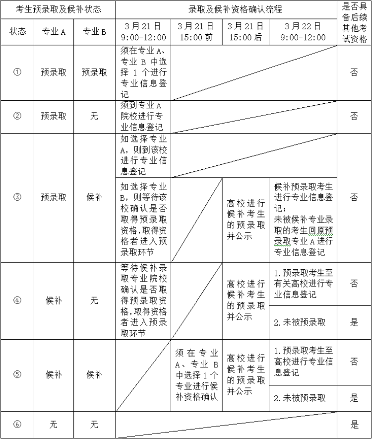 3.取得一个专业预录取、一个专业候补录取资格的考生,在3月21日9:00-12:00,可直接前往预录取专业院校办理录取专业信息登记;也可前往候补录取专业院校进行候补资格确认,如院校确认最终取得预录取资格,须在3月22日9:00-12:00,携带统一文化考试成绩单原件,前往预录取专业院校办理录取专业信息登记;确认后未取得预录取资格的考生,则须在3月22日9:00-12:00,回原预录取专业院校办理录取专业信息登记。