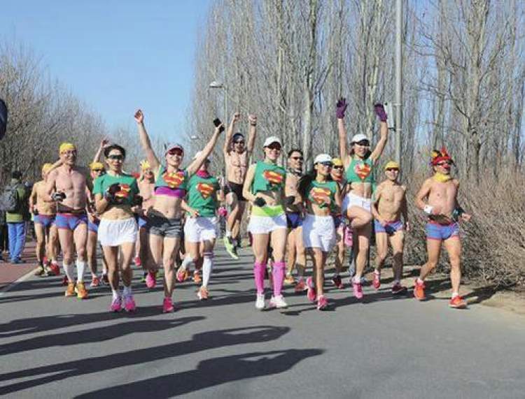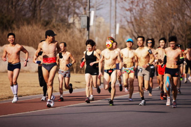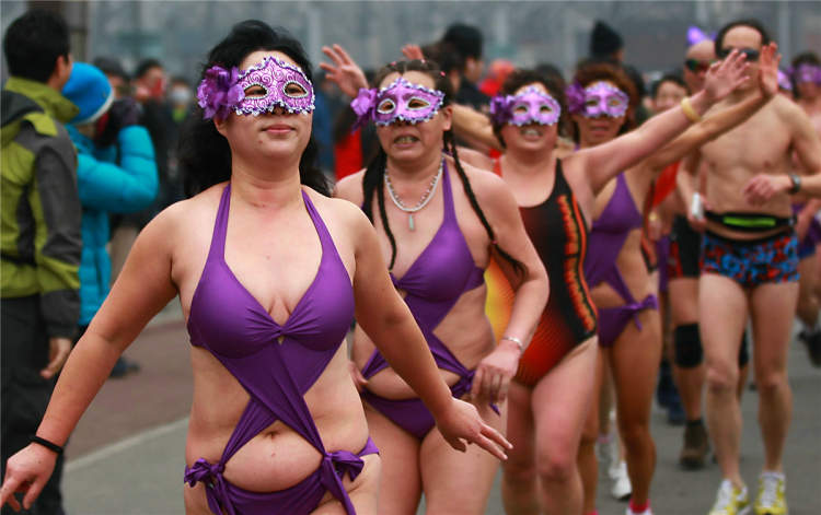 冬天寒冷的室外,女的两件、男的一件,露出大部分身体参与跑步运动,这样别具一格的形式让“光猪跑”落地中国的第一年,就拥有很高的人气,迄今已举办8年。