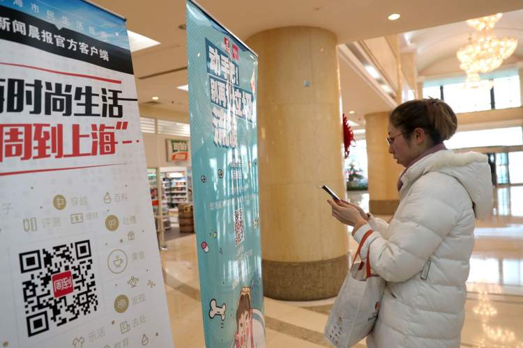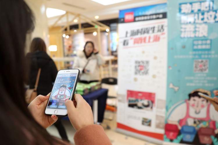 早上9点,在威海路755号上海报业集团大堂,线下活动展开。参与者只要下载周到,扫码参与游戏,获得10分,就可以领取上海标准家用垃圾袋套装,价值19.9元。