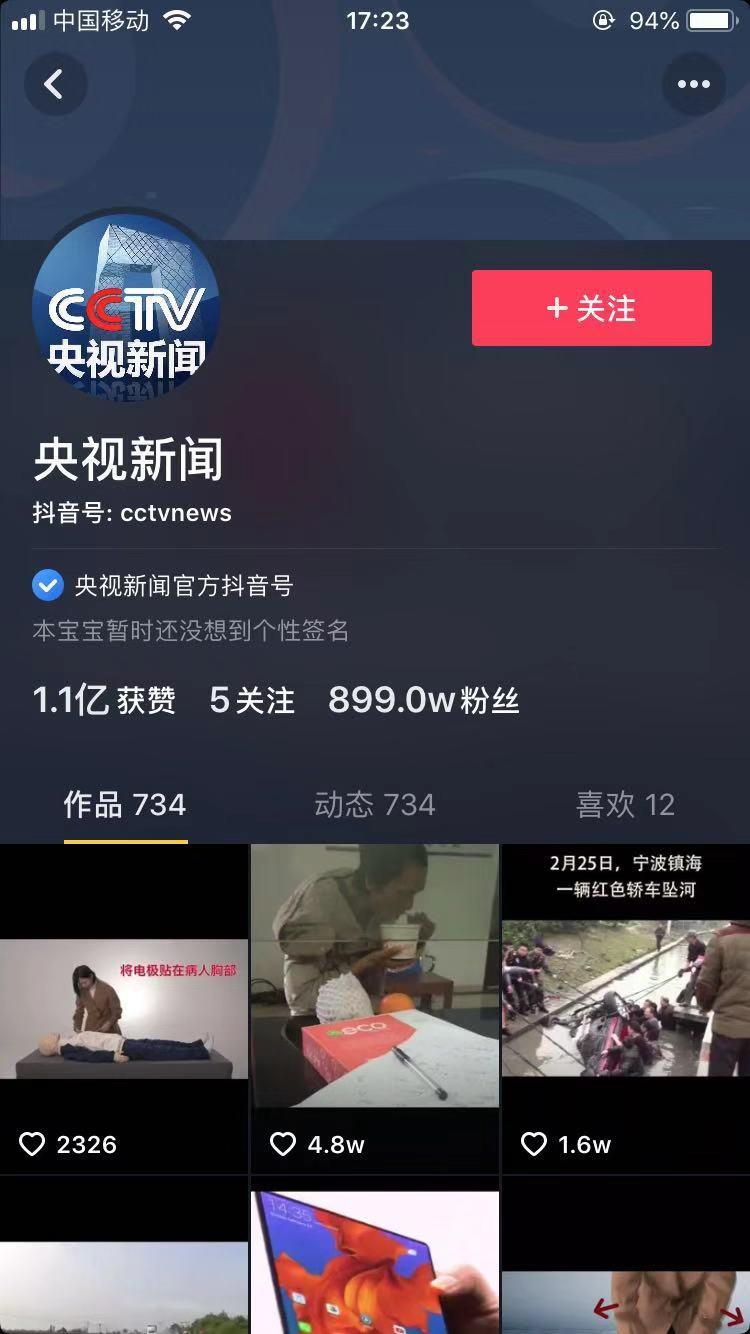 前不久,央视还在抖音上开设了账号,粉丝量达899万,获赞1.1亿之多。在每个抖音短视频下,有一行不停滚动的字:”@央视新闻创作的原声-@央视新闻”。