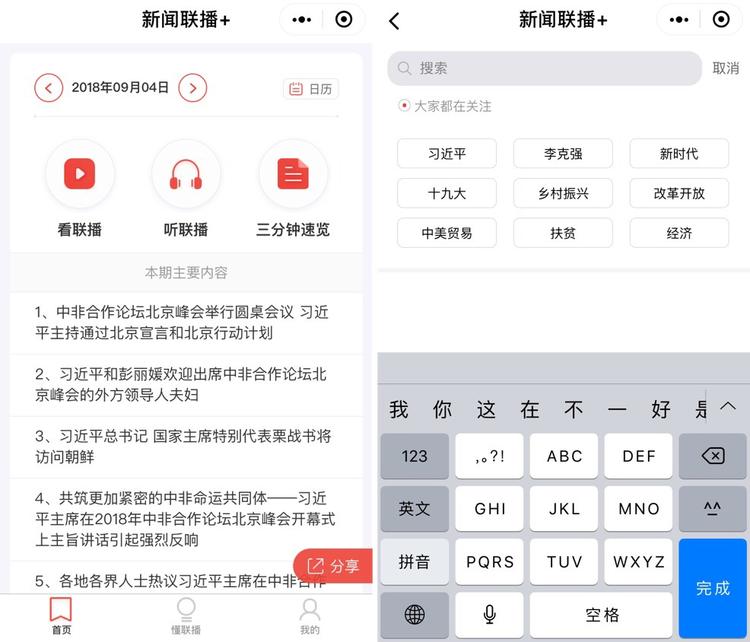 当然,用户还能选择感兴趣的内容,“私人定制”关注标签。目前,央视小程序关注标签有19个,用户最多可选7个。在“我收藏的”里,还能添加整期联播、单条联播以及央视快评。