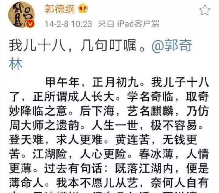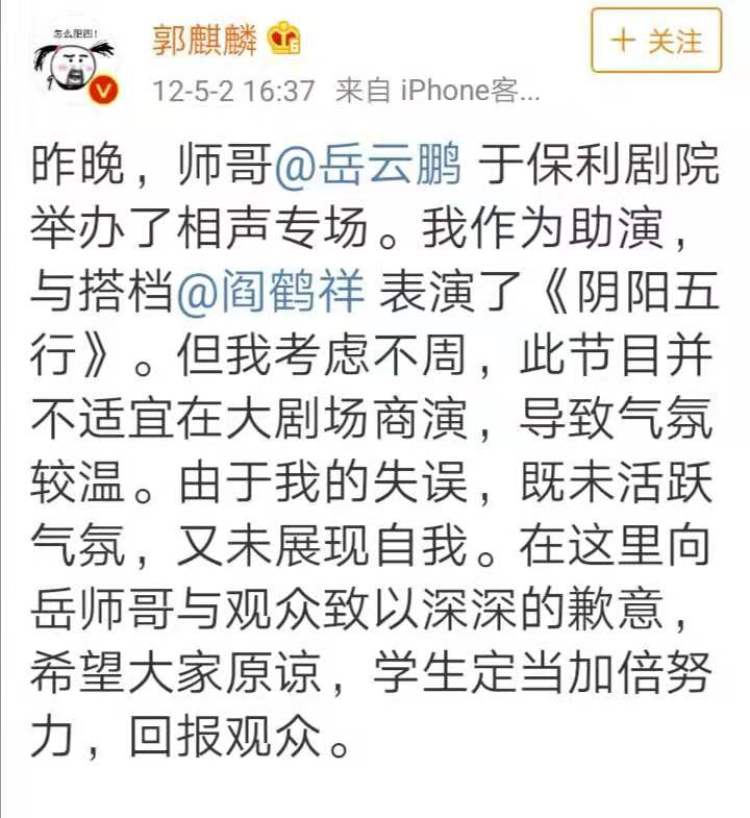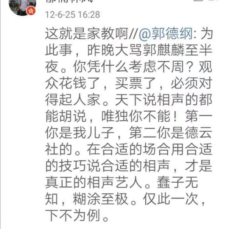 对儿子,郭德纲比对徒弟们更严格。2012年,郭麒麟还曾在微博为自己助演时考虑不周公开道歉。