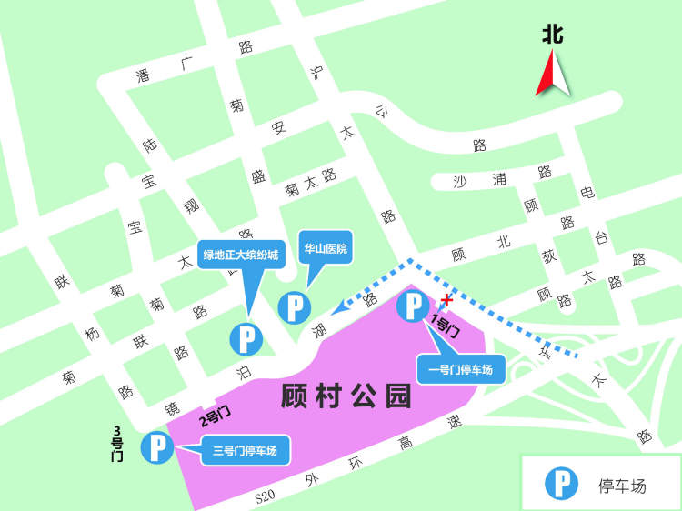 第一阶段:沪太路顾村公园1号门停车场达到饱和时,封闭公园1号门中心隔离,机动车至沪太路镜泊湖路左转,沿镜泊湖路按绿地正大缤纷城、公园3号门停车场、华山医院顺序依次有序停车(引导示意图如下)。