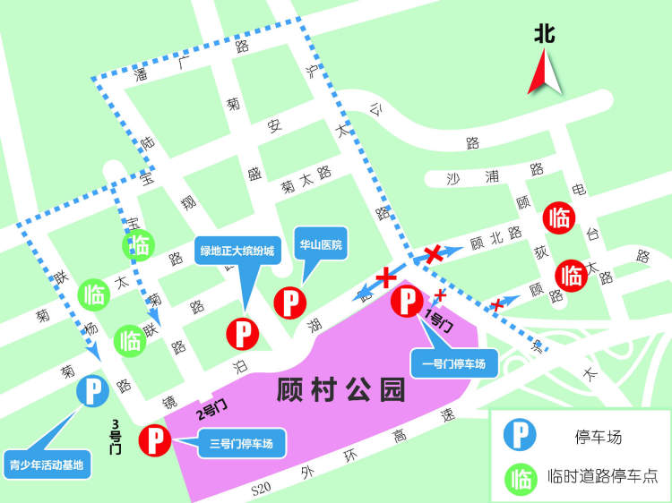 此外,顾太路等备用的道路临时停车点约有2000个停车泊位,包括顾太路(200泊位)、顾北路(200泊位)、菊联路(200泊位)、菊太路(700泊位)、宝菊路(150泊位)、联杨路(150泊位)。
