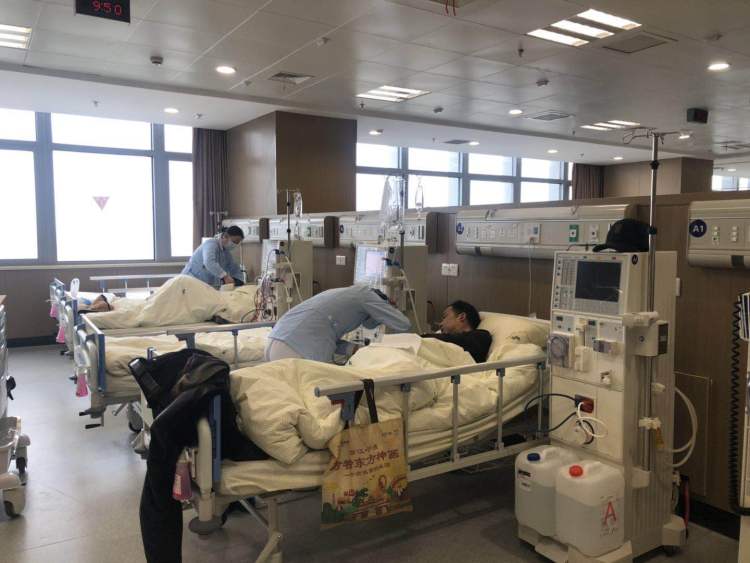 在透析室,已有两位病人在进行血透。在很多医院透析床位一床难求,仁济医院宁波医院配置了42个血透床位,一个月能接待160-170人次血透患者。