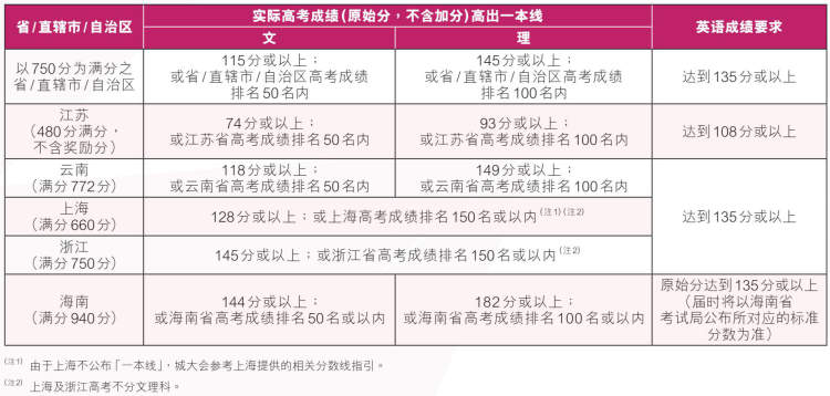 香港城市大学对于报考该校的上海地区考生,除了要求高考成绩外,还要求英语成绩不低于135分(满分150分)。