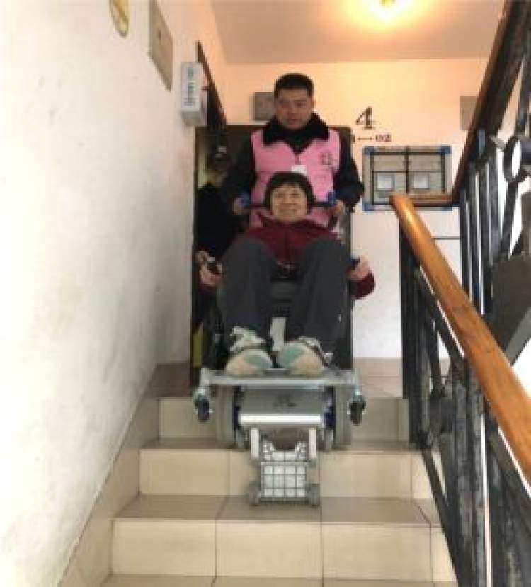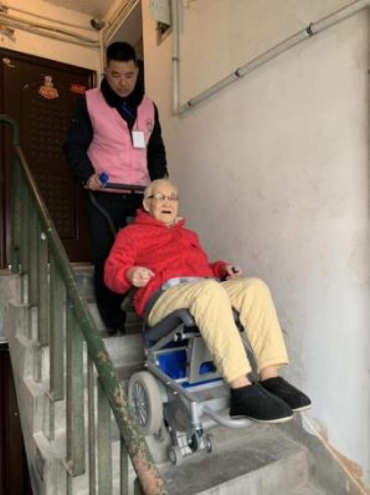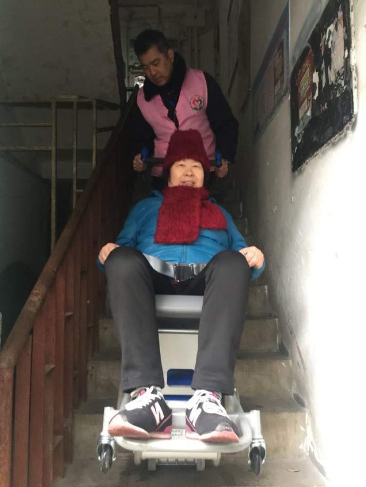 裘莲娟老人今年83岁,与老伴住在虬江社区,老人的腿由于是糖尿病足,有一条已被截肢,住在6楼的他们,每一次出行,都是由老人的儿子背上背下。老人的儿子也非常关注此服务项目,告知我们:“这些年来一直是我背上背下,再者随着年纪的上升,确实很累。由于房子面积的原因,我们也不住一起,老妈也考虑到我们平日要上班,平时她都是尽量不出门,但其实老人一直闷在家里对身体也不好,现在有了这个服务,2位老人都非常开心,而且服务也非常地准时,操作过程也非常安全,考虑的也非常周到,还购买了责任险”。