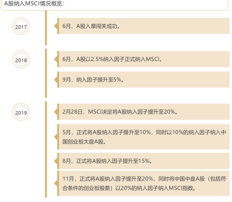 3月1日,MSCI公布对进一步增加A股在MSCI指数中权重的咨询结果, 决定将现有大盘A股在MSCI全球基准指数中的纳入比例由5%提高至20%,分三步分别在5月、8月和11月逐步落实,11月将中盘A股以20%纳入比例加入MSCI中国指数。纳入比例上调以及纳入中盘股和创业板股票意味着,A股占MSCI 新兴指数的权重将在今年11月升至3.3%(现为0.7%)。