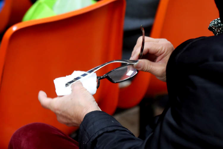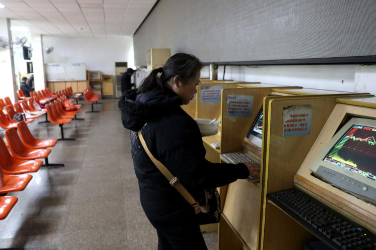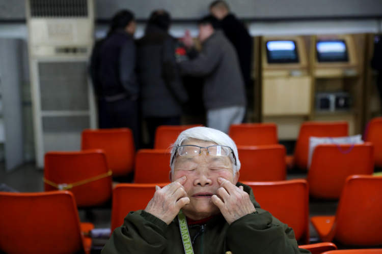 当日上午收盘,一位阿姨在证券所里做眼保健操。